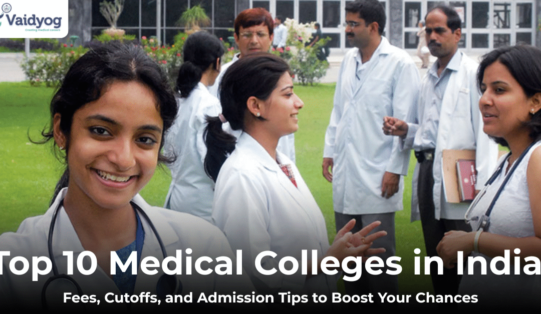 Are you dreaming of a career in medicine? Pursuing an MBBS degree from one of India’s top medical colleges can be the gateway to a fulfilling and lucrative profession. With the National Eligibility cum Entrance Test (NEET) as the primary gateway for MBBS admissions in India, selecting the right medical college is crucial. In this comprehensive guide, we’ll explore the top 10 medical colleges in India, including their fees, NEET cutoffs, and specific admission tips. We’ll also share general strategies to boost your chances of securing a seat in these prestigious institutions. Plus, for those eyeing a swift entry into the healthcare job market post-graduation, we’ll highlight why Vaidyog is the best healthcare/medical job portal to get a job soon.